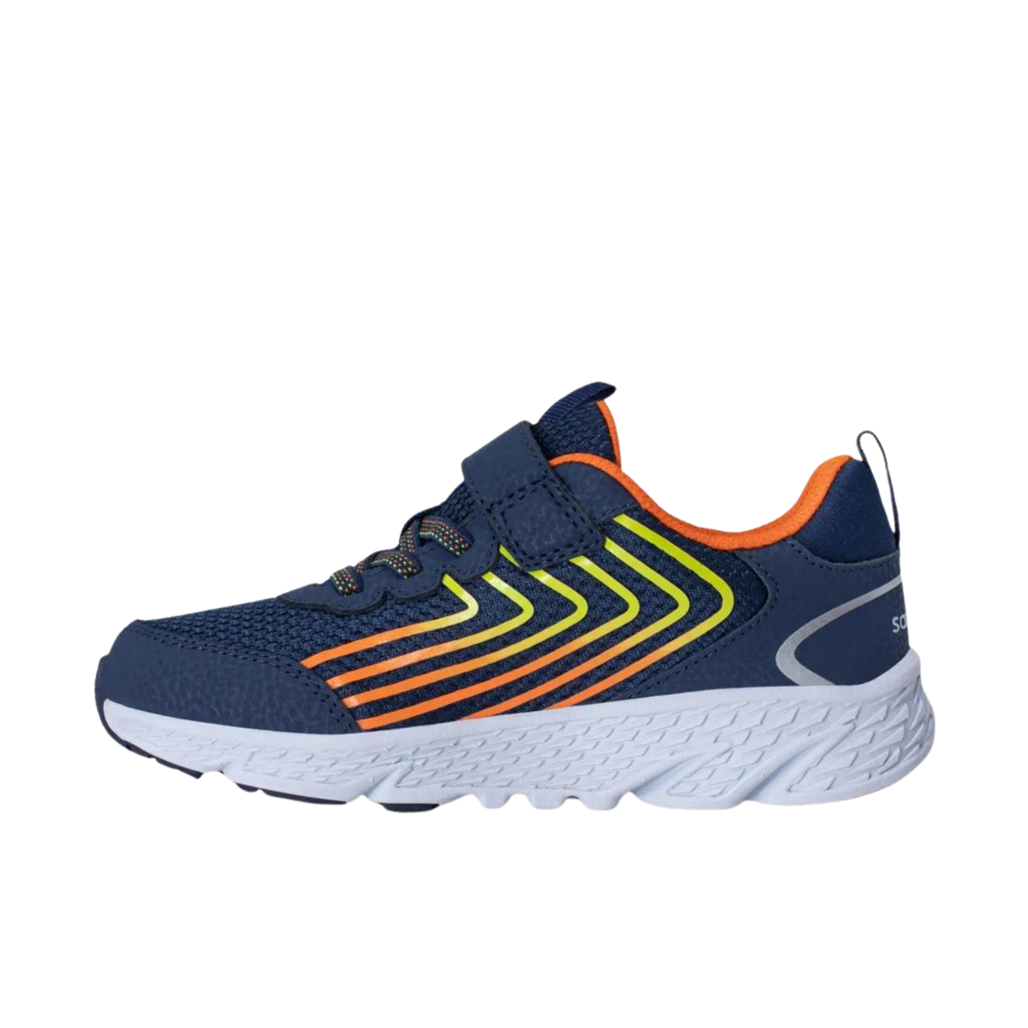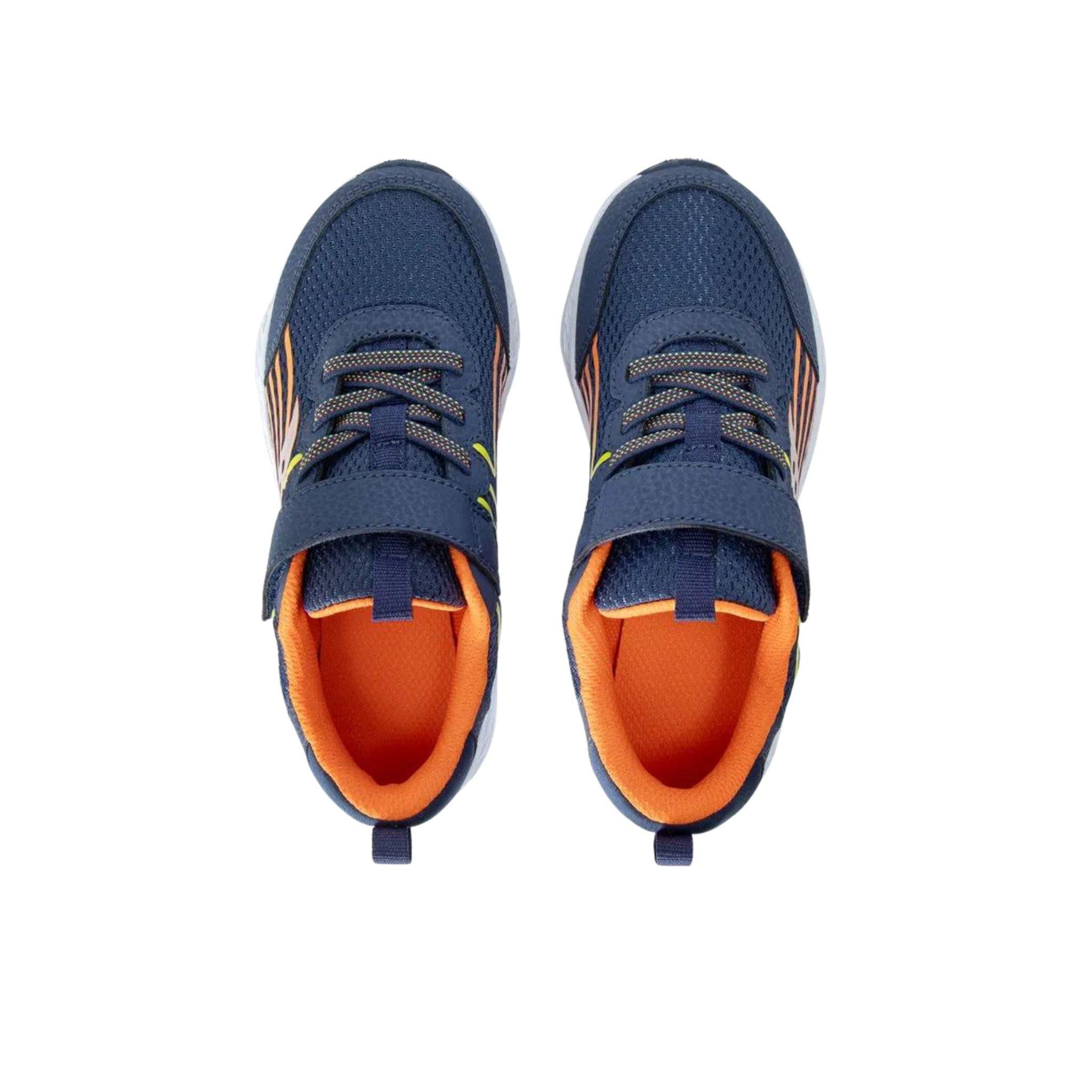 These navy and orange sneakers feature a lightweight design that won't slow them down, plus a durable construction that handles everything from recess races to after-school activities. The cushioned sole provides comfort during hours of running and playing, while the secure fit keeps feet locked in place through every jump and dash. Perfect for active kids who live life at full speed.