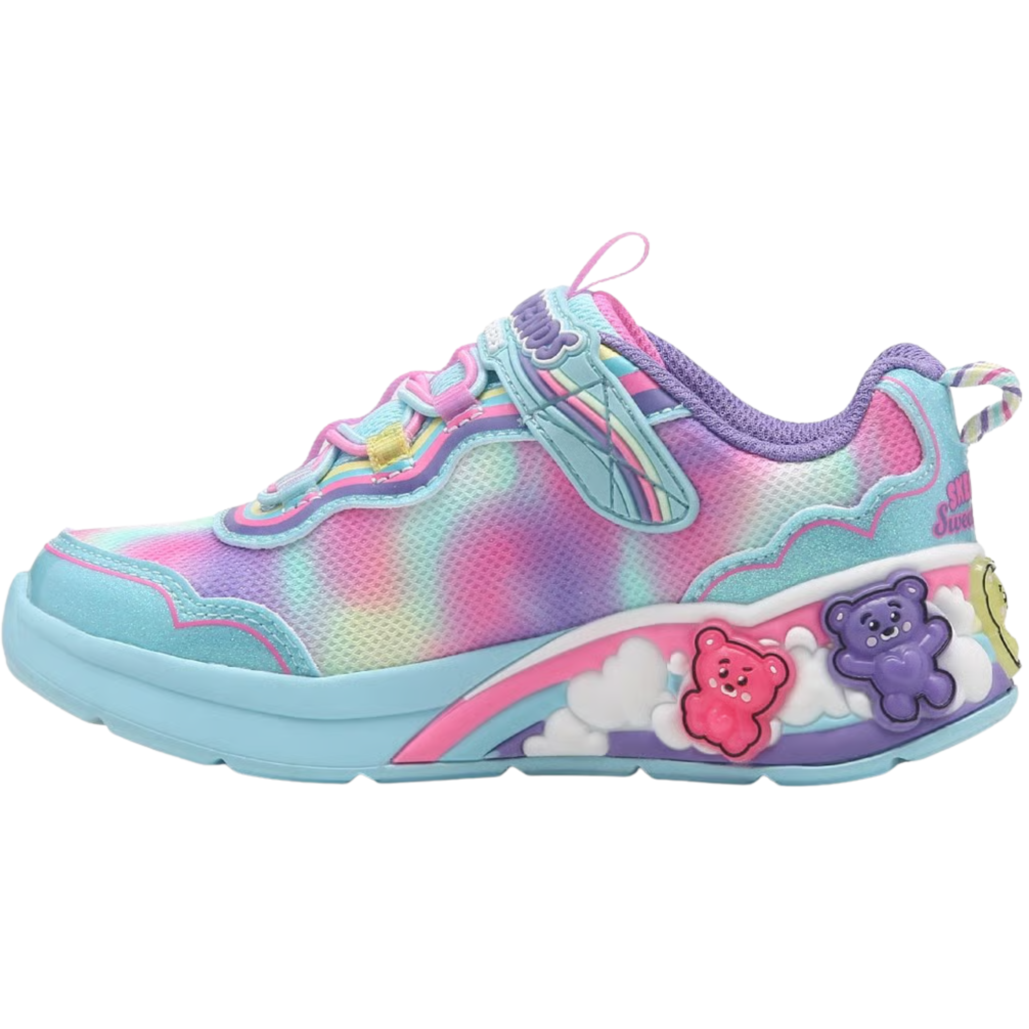 These light-up sneakers feature a fun gummy bear-themed design with a cushioned, shock-absorbing midsole that keeps little feet comfortable all day. The easy hook-and-loop closure and elastic laces make getting ready quick and simple, while the padded collar and smooth lining provide extra comfort. Perfect for kids who love bright, cheerful footwear that's as fun to wear as it is to look at.