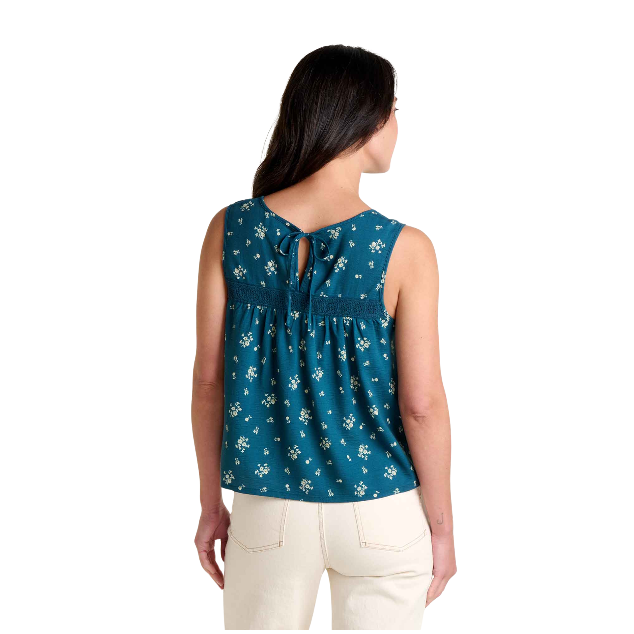 The soft organic cotton crepe feels breathable and lightweight, while pintuck detailing and delicate lace accents add understated sophistication. Scoop neck with self-fabric tie, bra-friendly straps, and a 21-inch length make it the perfect casual-elegant essential for summer.