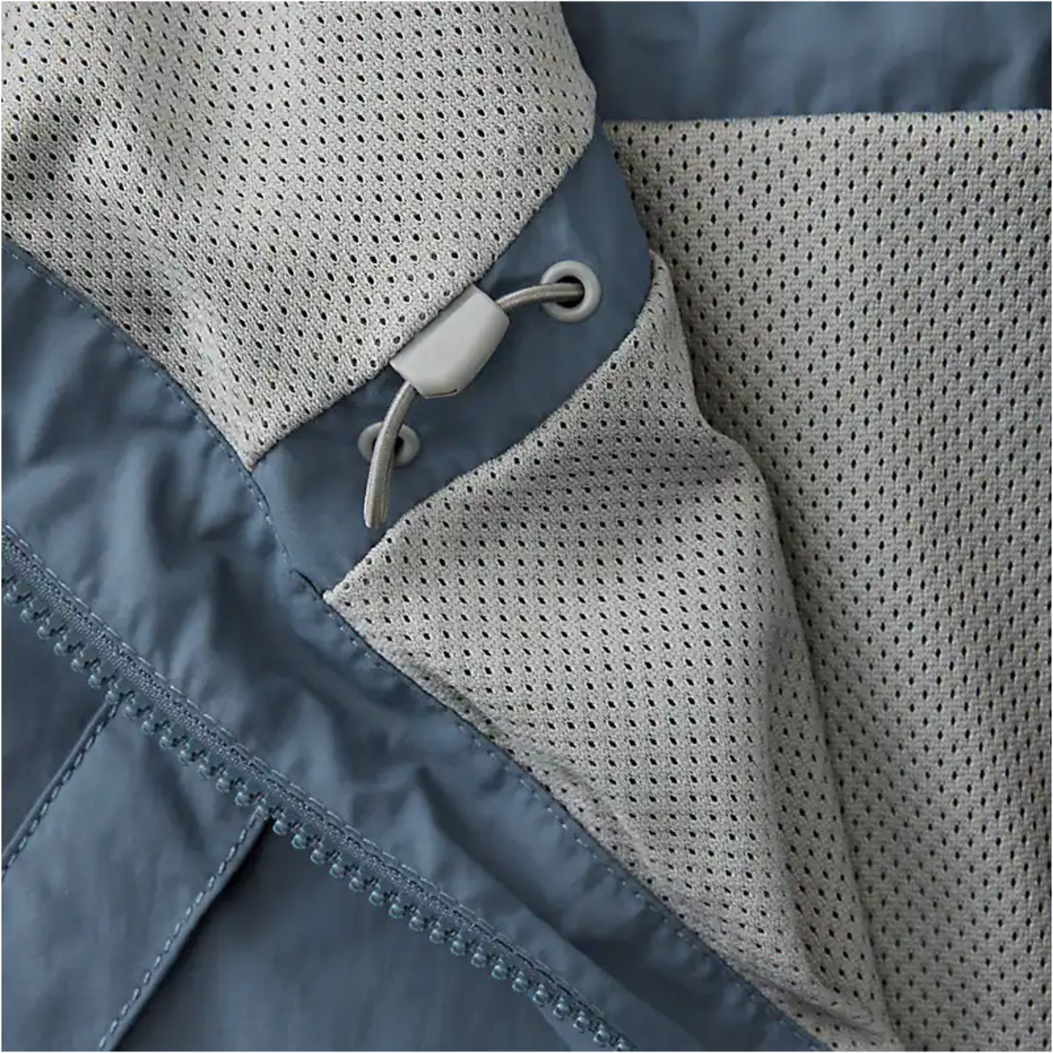 - Attached three-piece hood with drawcord and barrel lock adjusters