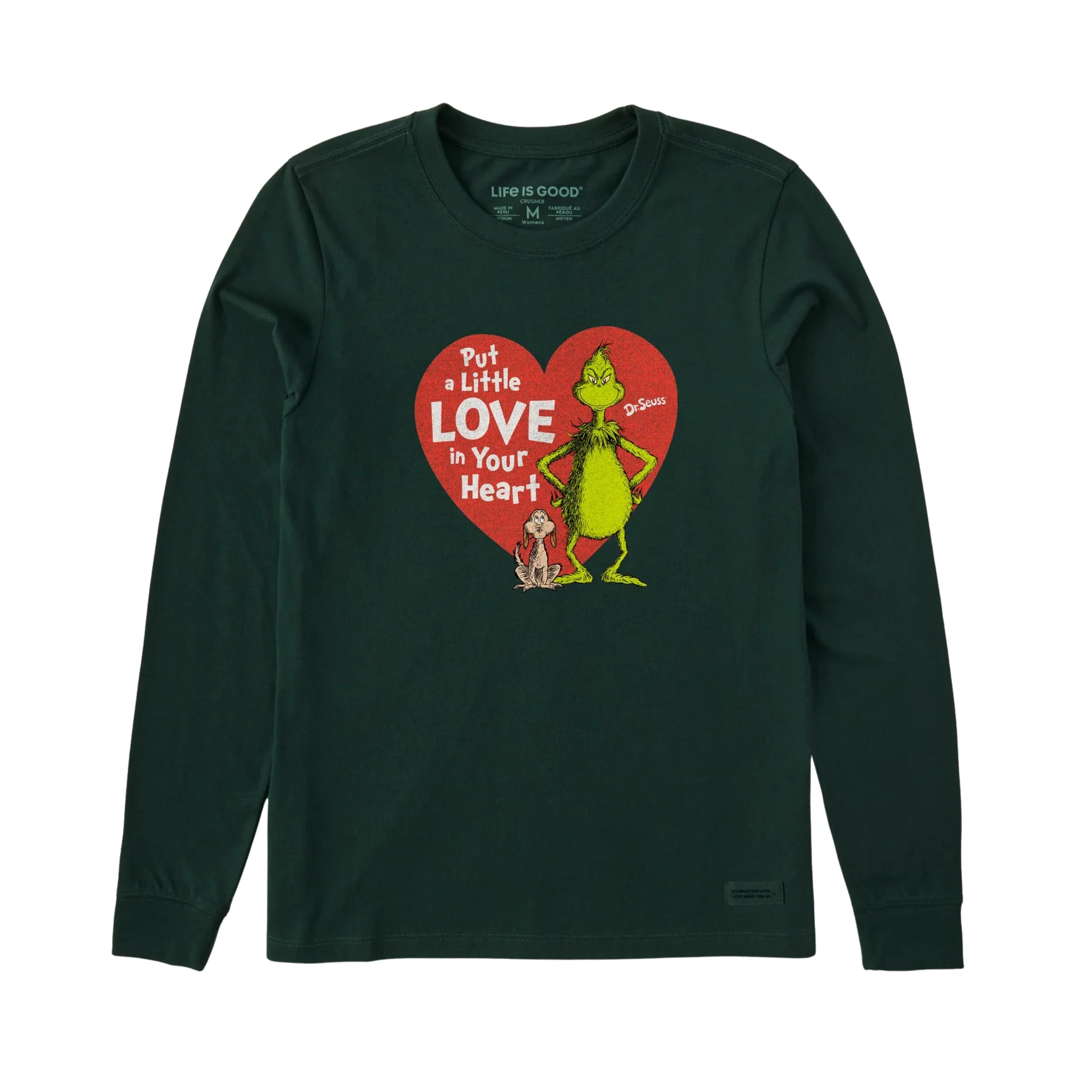 Celebrate the holiday spirit with this playful green long sleeve tee featuring the mischievous Grinch spreading a little love.