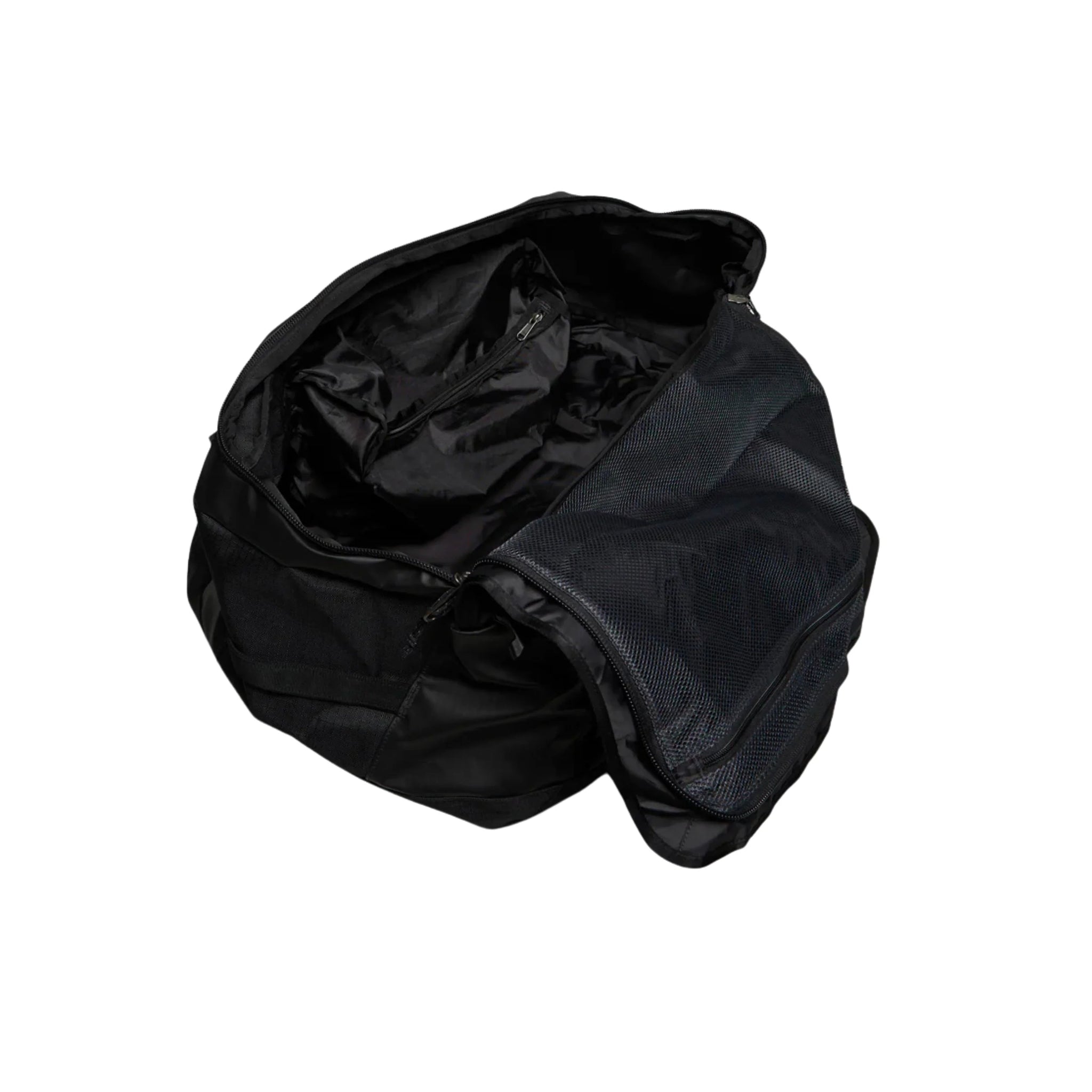 A zippered side pocket can be reached from the outside or inside of the bag, and when empty, the duffel stuffs into the pocket for compact, self-contained storage; an interior mesh lid pocket keeps essentials organized and close at hand