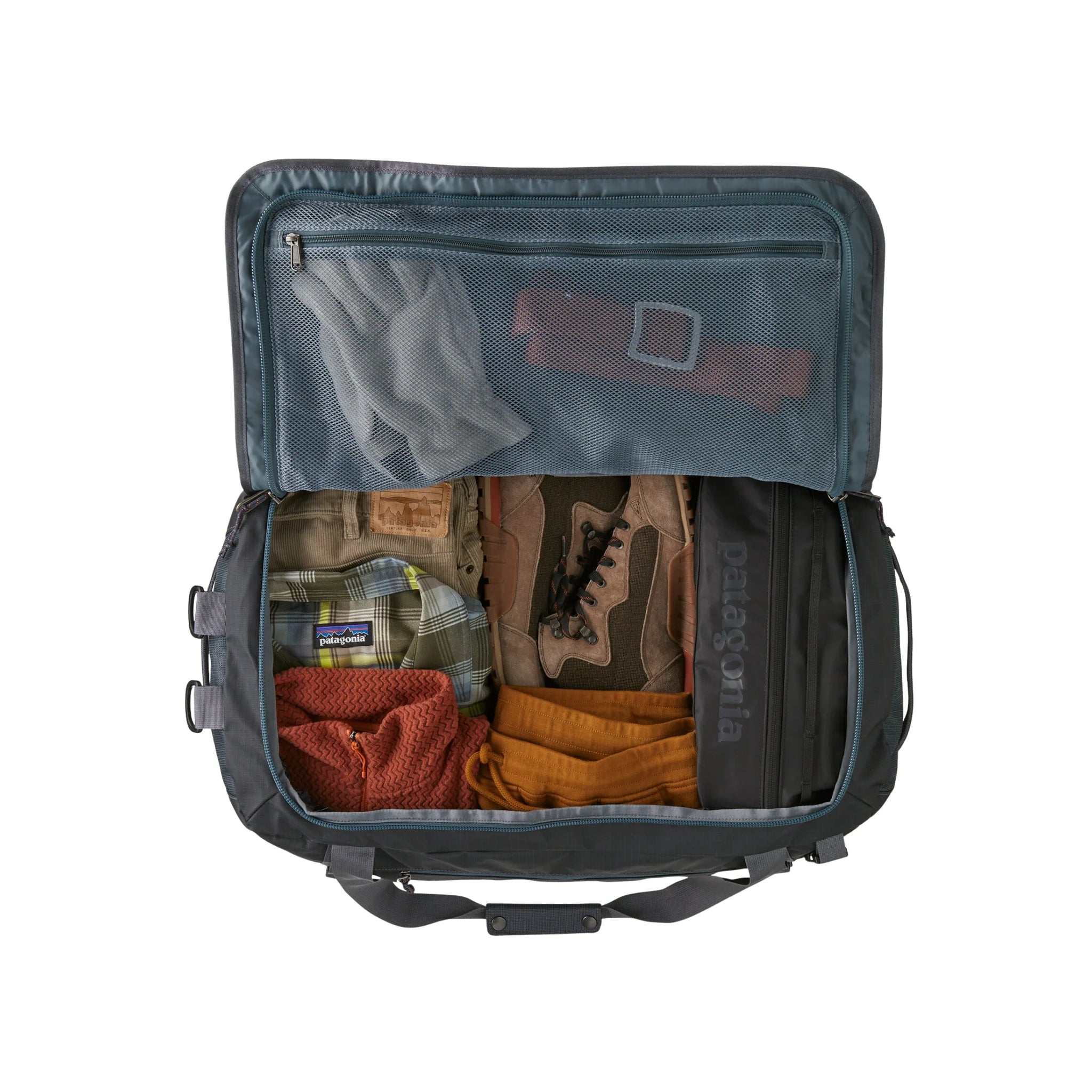 A zippered side pocket can be reached from the outside or inside of the bag, and when empty, the duffel stuffs into the pocket for compact, self-contained storage; an interior mesh lid pocket keeps essentials organized and close at hand