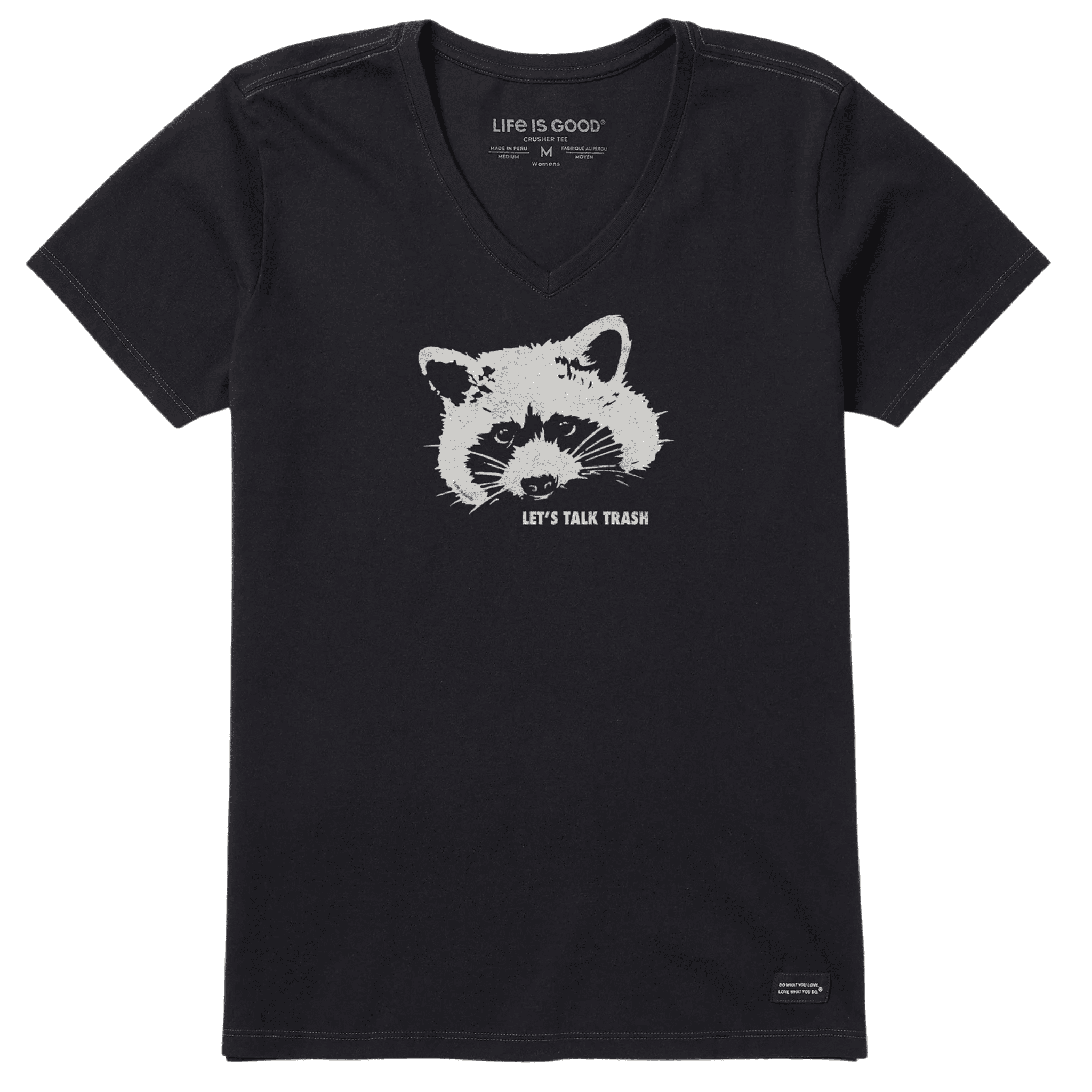 Life Is Good Women's Raccoon Short Sleeve Crusher Vee - Faded Black Embrace your mischievous side with this playful crusher vee featuring a cheeky raccoon design.