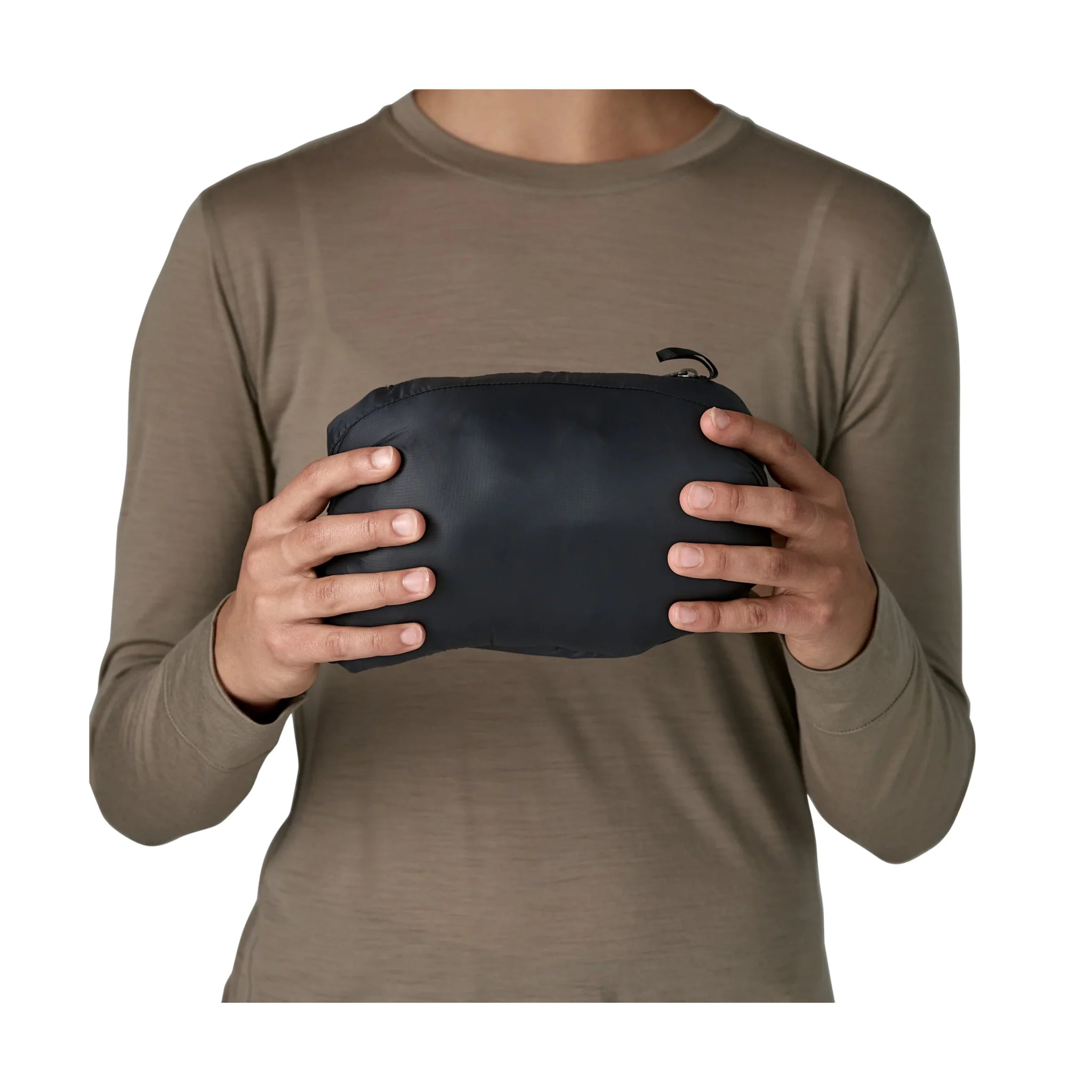 Two on-seam handwarmer pockets have invisible zippers, one interior zippered left-chest pocket converts to a stuffsack with a carabiner clip-in loop