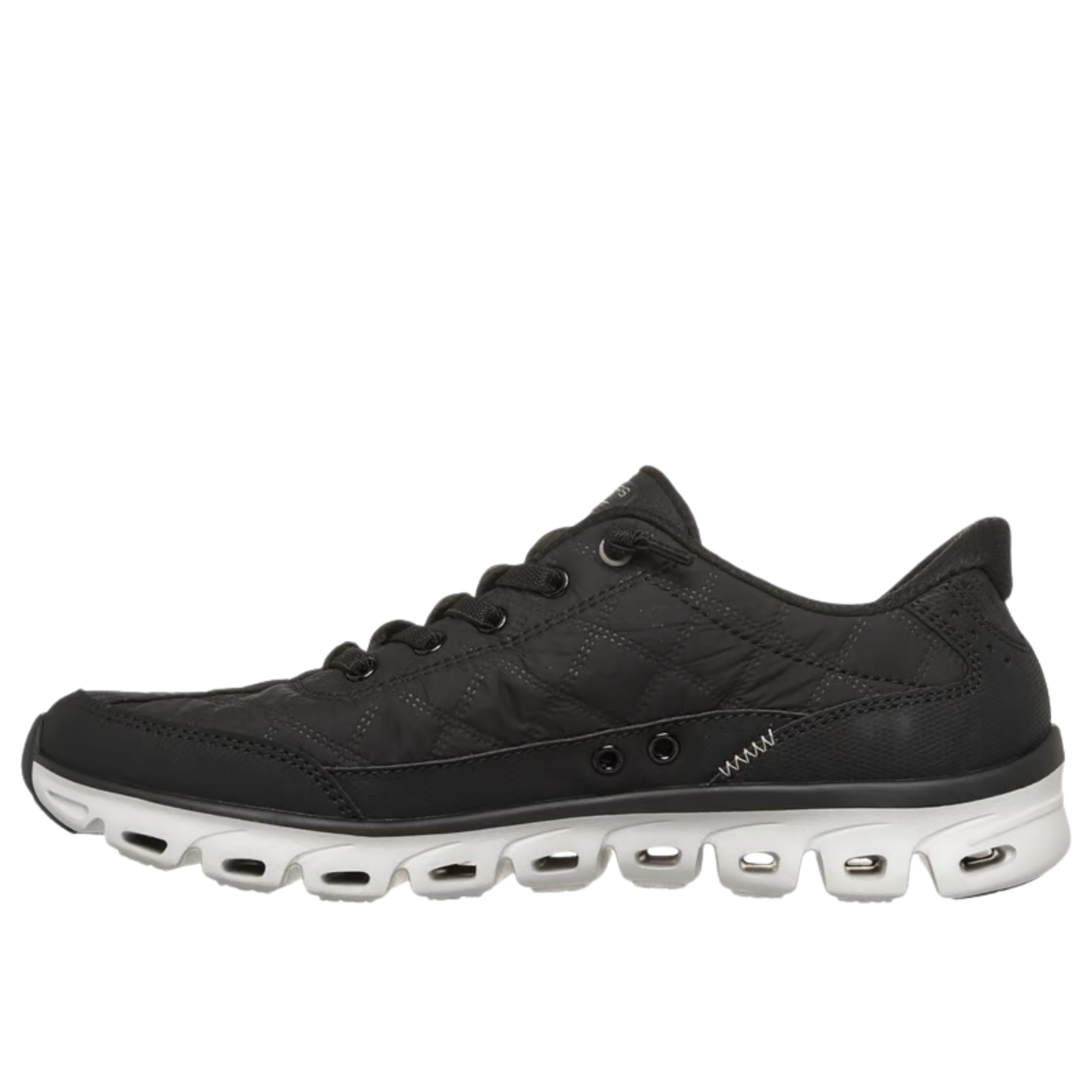 - Air-quilted fabric and duraleather upper with tied-off stretch laces